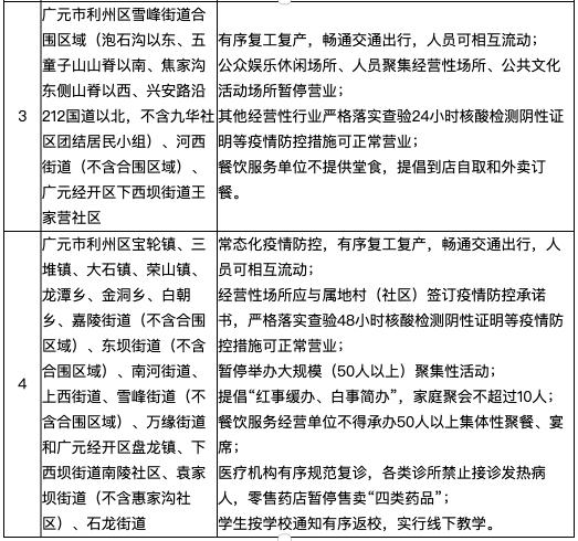 一、广元市利州区嘉陵街道与东坝街道合围区域(嘉陵江以东、将军桥云栈路以南、凤翼路以西、劝业巷至刘家巷以北),雪峰街道九华社区团结居民小组,河西街道合围区域(尖山梁以东、西二环以南、李家梁以西、利州西路以北),广元经开区下西片区合围区域(西北河以东、民权村以南、宝成铁路以北、周家沟以西),继续执行原临时性社会管控措施不变。