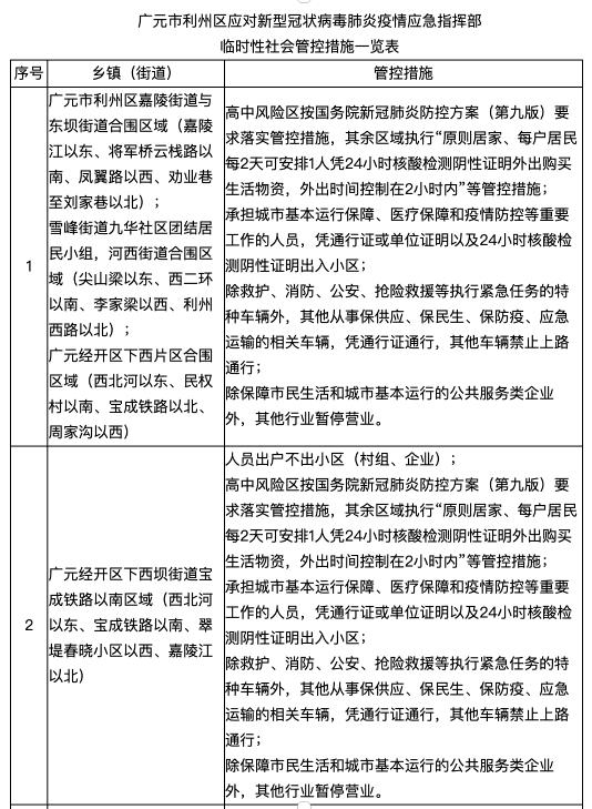 四、广元市利州区(含广元经开区)其他区域临时性社会管控措施不变。现有中高风险区、临时性封闭管理的场所(区域)按国务院新冠肺炎防控方案(第九版)中关于中高风险区的管理要求落实管控措施。进出利州区(含广元经开区)的高速路口、机场、火车站、汽车站、国省干道等继续实行管控,人员进出区须持24小时核酸检测阴性证明。
