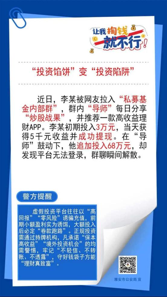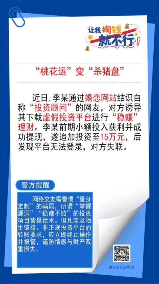广大群众请牢记诈骗手段花样多,防骗知识常记心,不扫描不明二维码、不点击不明链接、不下载非官方APP。保护好个人信息,不向他人透露短信验证码、银行卡号、银行卡密码,更不要进行屏幕共享和人脸认证操作。如遇可疑来电,请果断挂断电话并拨打110核实,守护好自身财产安全,共筑反诈防线。