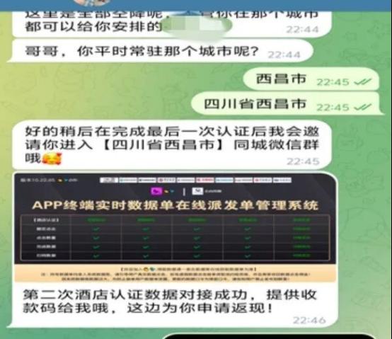 接着是对方温柔的声音:“我们平台需要完成三次认证就可以为你匹配同城最优质的小姐姐为你服务,但放心,这些费用是为了保障小姐姐的安全,认证成功后,会连本带利返还到你的账户。刚刚入会是第一次认证,再充300元完成第二次酒店认证费用,我们就会给你订好酒店,立马通知小姐姐过去!”