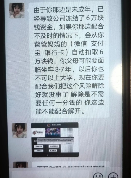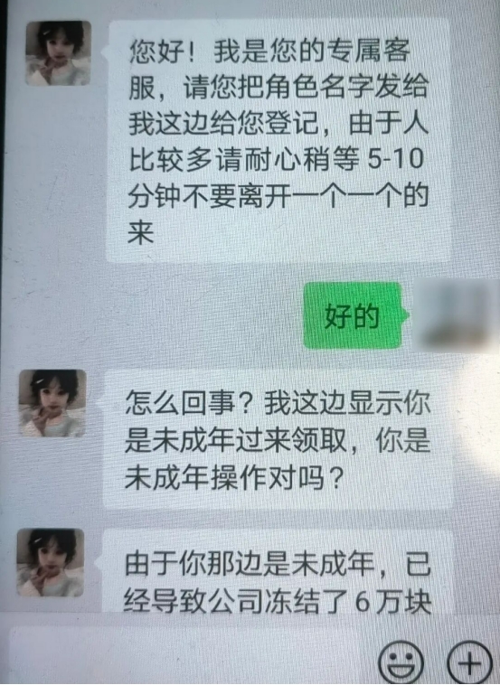 她高兴的询问游戏福利“客服”。谁知对方语气一转,变成严肃的“法务员”并称:“小朋友,由于你是未成年参与活动,造成我们公司账户被冻结6万元!现在需要你协助解冻,不然你爸妈要坐牢,你以后也别想上大学了!”