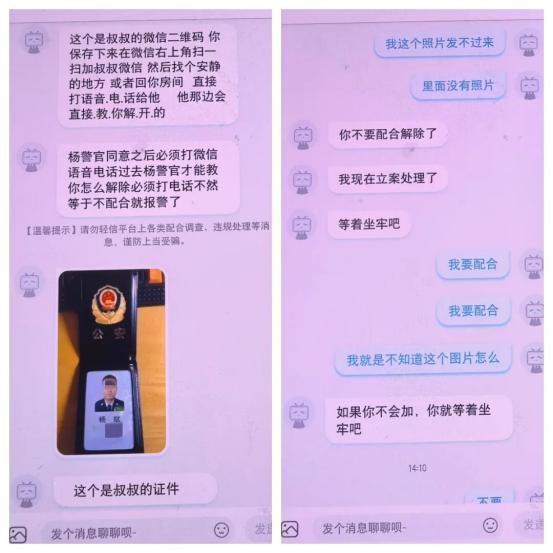 出于害怕,然然当即拒绝领取皮肤,但是诈骗分子继续“恐吓”,甚至发来虚假的“警官证”照片,并要求必须配合公司“解冻”,否则直接报警抓捕。