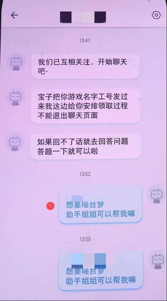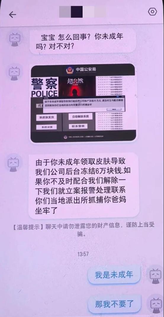 在咨询领取皮肤的过程中,对方突然发来消息,称然然是未成年人,领取皮肤时导致公司后台被“冻结6万元”。如果不及时配合“解冻”,公司就会“报警”,甚至还要联系“派出所”抓捕然然父母。